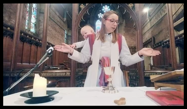 On this international day of women and inclusivity, I am inspired by an image that first came to me on Facebook. A pastor/priest is presiding at communion, standing at the table, and her infant child is on her back in a baby carrier. She reaches out to bless the elements and so does the child. Numerous complaints litter the Facebook post about how the woman might be disrespecting the priestly role or the