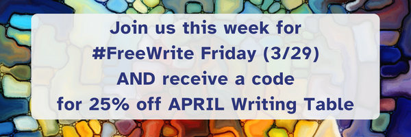 You are invited to show up, too. The writing table has Free Write Friday each week. This week will be a special Good Friday emphasis. We are offering an April discount code for people who attend this Friday. See you there?