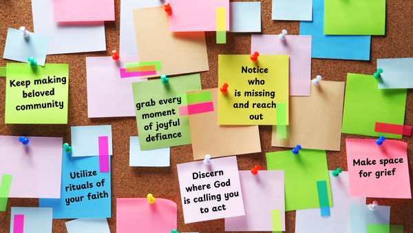 tradition that are underutilized. Use their power to invite people into the work - both gatherings for worship and times of public protest. Rituals help us make meaningful space for lament, connection, and creation of beloved community.