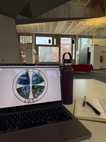 As you are opening this email, I'm beginning week four of my time at the Collegeville Institute. This photo was taken while I was working in the Saint John's Library last week. The emblem on my computer is a stained glass and wrought iron piece of art commemorating the founding of the Collegeville Institute.Â