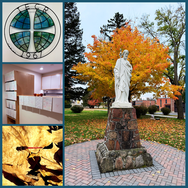 conversation, laughter and prayer in three different communities here in the Collegeville region, all shaped by the Rule of St. Benedict directly or indirectly. The statue above is on the St. Ben's College campus. The flaming orange leaves offer their own invitation to stop and notice the stunning beauty of creation.